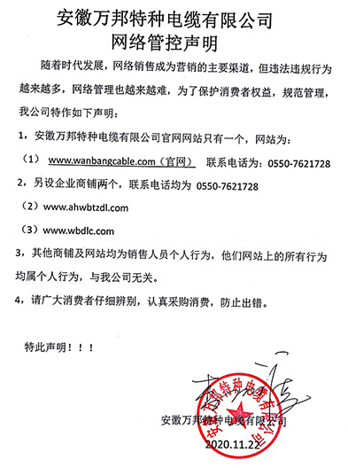 鄭重聲明:安徽萬邦特種電纜有限公司官方網站為:www_wanbangcable_com.zhizufang.com.cn,除此之外無任何子網站或合作網站,其余均為假冒偽劣。電話:0550-7621728 13485756353 地 址:安徽省天長市滁州高新技術產業開發區經四路29號